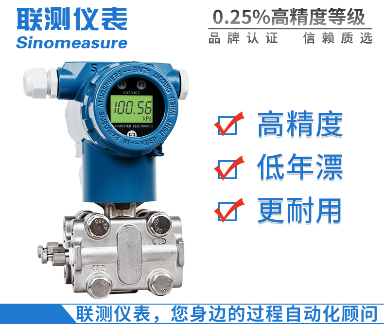 SIN-3051系列壓力變送器利用差動電容檢測的原理,當膜片兩側壓力不一致時,使容室中測量膜片產生位移,其位移量與壓力差成正比,通過電路處理將電容變化量轉換成4~20mA的二線制電流或電壓信號,可帶上458協議或者HART通訊協議功能。該變送器具有堅固抗振,量程,零點和阻尼現場連續可調。