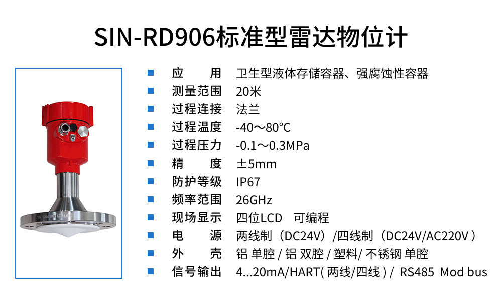 聯測SIN-RD906雷達液位計,適用于衛生型液體存儲容器。雷達液位計天線發射及窄的微波脈沖,這個脈沖以光速在空間傳播,遇到被測介質表面,其部分能量被反射回來,被同一天線接收。發射脈沖與接收脈沖的時間間隔與天線到被測介質表面的距離成正比,多用于水位、料位與化工場合。
