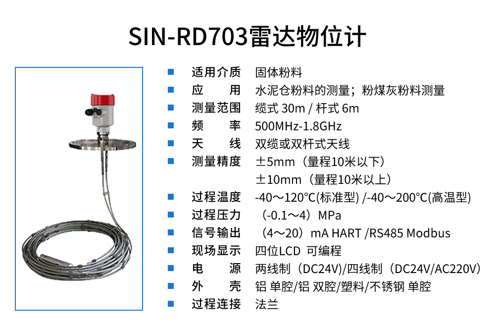 聯測SIN-RD703雷達料位計,適用于水泥倉粉料。雷達液位計天線發射及窄的微波脈沖,這個脈沖以光速在空間傳播,遇到被測介質表面,其部分能量被反射回來,被同一天線接收。發射脈沖與接收脈沖的時間間隔與天線到被測介質表面的距離成正比,多用于水位、料位與化工場合。