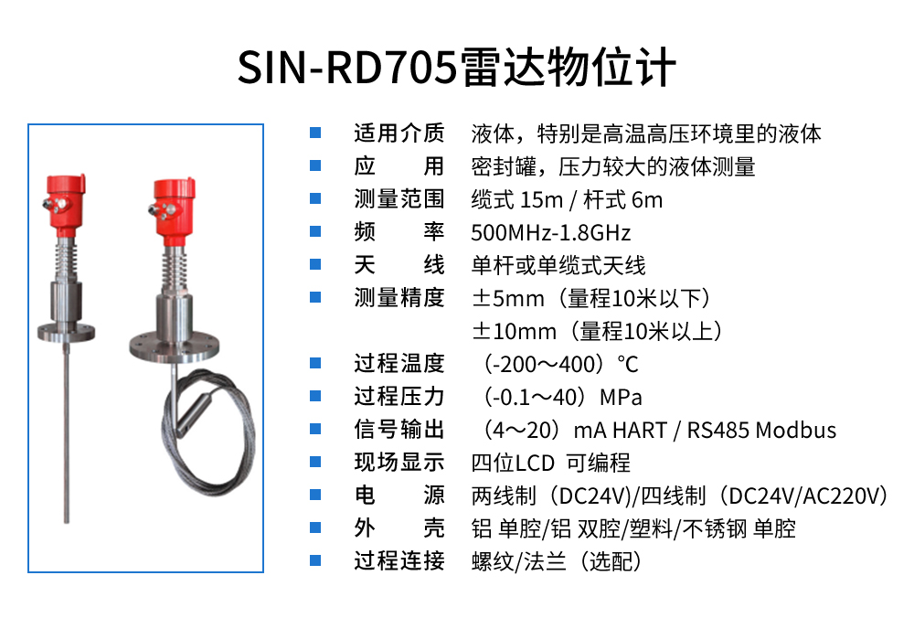 聯(lián)測(cè)SIN-RD705雷達(dá)液位計(jì)_適用于密封罐,高溫高壓液體。雷達(dá)液位計(jì)天線發(fā)射及窄的微波脈沖,這個(gè)脈沖以光速在空間傳播,遇到被測(cè)介質(zhì)表面,其部分能量被反射回來,被同一天線接收。發(fā)射脈沖與接收脈沖的時(shí)間間隔與天線到被測(cè)介質(zhì)表面的距離成正比,多用于水位、料位與化工場(chǎng)合。